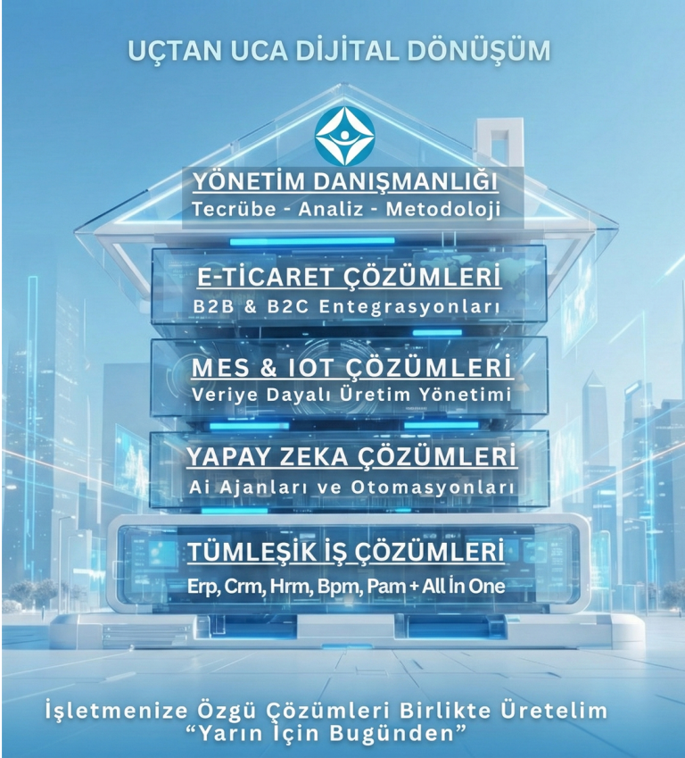 Bize ait olan “Uçtan Uca Dijital Dönüşüm Modeli” ile; ERP, Yapay Zeka, E-Ticaret ve MES bileşenlerini tek bir uyumlu mimaride sunuyoruz. Parça parça değil, entegre ve dinamik bir çözüm sunarız.